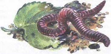 Вытягиваясь из норки, дождевой червь обшаривает землю вокруг и захватывает ртом сырые гниющие листья, полусгнившие травинки... Всё это он затаскивает в свою нору и проглатывает. Передвигаясь в почве, он заглатывает и её. Вот такая у него пища. Наверное, ты подумаешь, что она очень невкусная. Но здесь уж ничего не поделаешь, так распорядилась природа. Дождевому червю полагается есть то, что другие животные есть не могут.