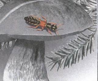 Учёные называют этого жука грибником, а если совсем точно, то грибником рыжим. Называют так за то, что он встречается в грибах и окрашен главным образом в рыжий цвет. Впрочем, голова и часть брюшка у него чёрные. Голова у грибника большая, а на ней длинные, словно кинжалы, челюсти. Другое название этого жука — хищник рыжий. Он действительно хищник, но опасен только для мелкой живности, обитающей в грибах. И прежде всего для маленьких "червячков" — личинок грибных комариков и мушек, тех самых, из-за которых грибы бывают червивыми.