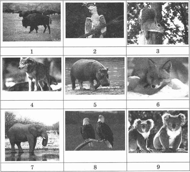 11. Ниже представлены изображения животных. Какие из этих животных обитают в естественной среде (не в зоопарке) на территории, выделенной на фотографии в задании 10, если известно, что она находится в том же тепловом поясе, что и Евразия? Запиши номера, под которыми указаны эти животные.