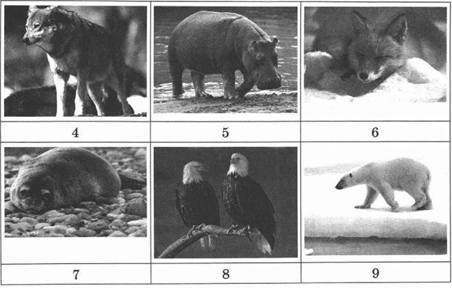 11. Ниже представлены изображения животных. Какие из этих животных обитают в естественной среде (не в зоопарке) на территории, выделенной на карте в задании 10? Запиши номера, под которыми указаны эти животные.