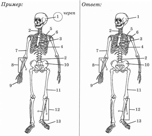15. Рассмотри изображение скелета человека. На изображении справа обведи кружком номер и подпиши следующие части тела человека: лопатку, кисть, голень.