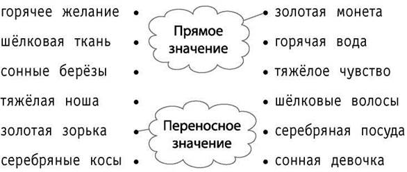 3. Покажи линиями, какое словосочетание имеет прямое значение, а какое — переносное. Объясни значение каждого словосочетания.