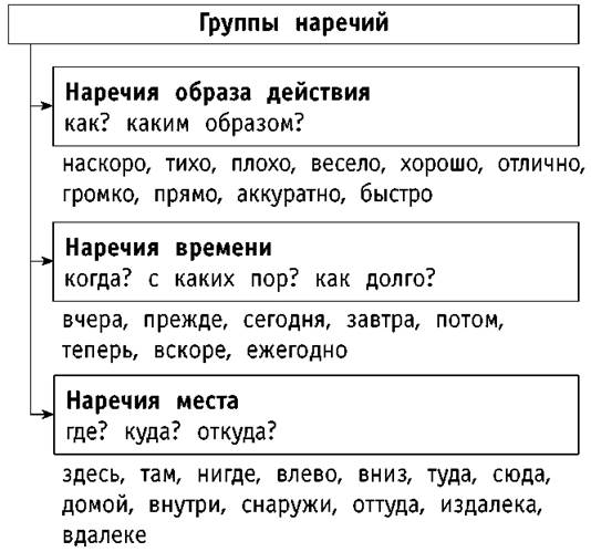 По значению наречия делятся на группы.