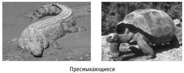 Черепахи, крокодилы, ящерицы, змеи относятся к классу пресмыкающихся. Тело этих животных покрыто сухими чешуйками и щитками. У черепах сросшиеся щитки образуют прочный панцирь.