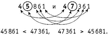 Многозначные натуральные числа с одинаковым количеством цифр сравниваются поразрядно. При сравнении переходят от самого старшего разряда к младшим: