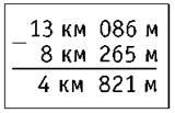 13 км 086 м - 8 км 265 м = 13 086 м - 8 265 м = 4 821 м = 4 км 821 м