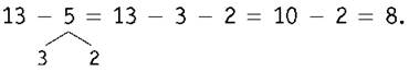 Число 5 удобно представить в виде суммы чисел 3 и 2. Вычитаем число 5 частями. Сначала из 13 вычитаем 3. Получится 10. Затем из 10 вычитаем 2. Получится 8.