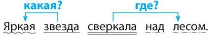 Ставлю вопрос от подлежащего: звезда (какая?) яркая. Это определение. Подчёркиваю волнистой линией. Нахожу второстепенный член предложения, который поясняет сказуемое. Ставлю от сказуемого вопрос: сверкала (где?) над лесом. Это обстоятельство. Подчёркиваю так: ![]()