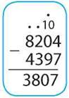2. Вычитание начинаем с единиц. Проверяем, возможно ли из единиц уменьшаемого вычесть единицы вычитаемого. Если нет, то занимаем 1 десяток (10 единиц) из десятков уменьшаемого. Ставим над десятками точку, чтобы об этом не забыть.