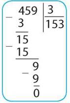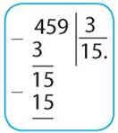 4) Сносим следующую цифру — 5. Второе неполное делимое (15) делим на 3. Оно делится без остатка: 15 : 3 = 5. Пишем цифру 5 в частном. Находим остаток: 15 - 15 = 0, нуль не пишем.