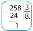 3) Делим первое неполное делимое 25 на 3. Ближайшее наименьшее число, которое делится на 3 без остатка, — 24: 24 : 3 = 8. Записываем в частном первую цифру — 8. Из 25 вычитаем 24, находим остаток 1.