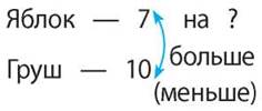 В одной корзине 7 яблок, а в другой — 10 груш. На сколько груш больше, чем яблок?